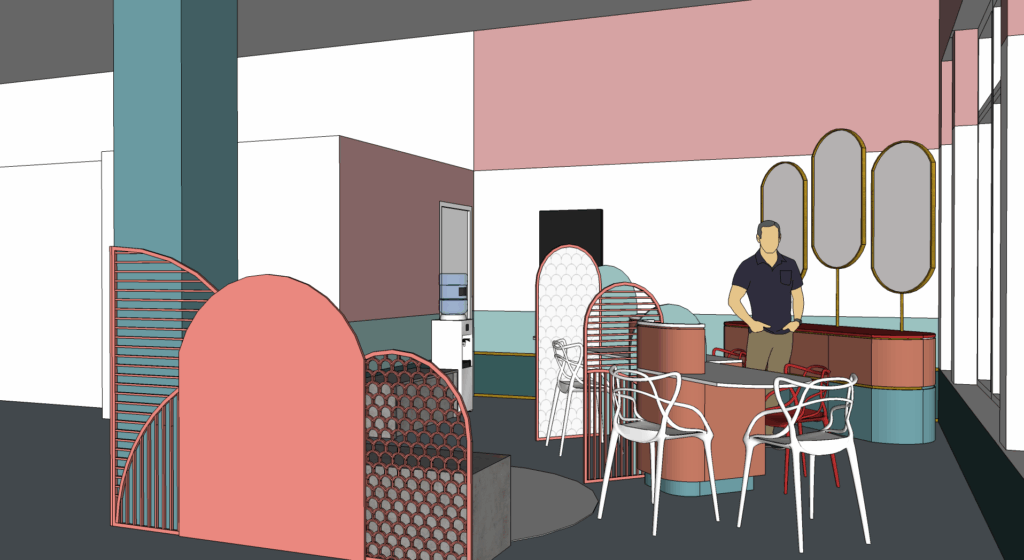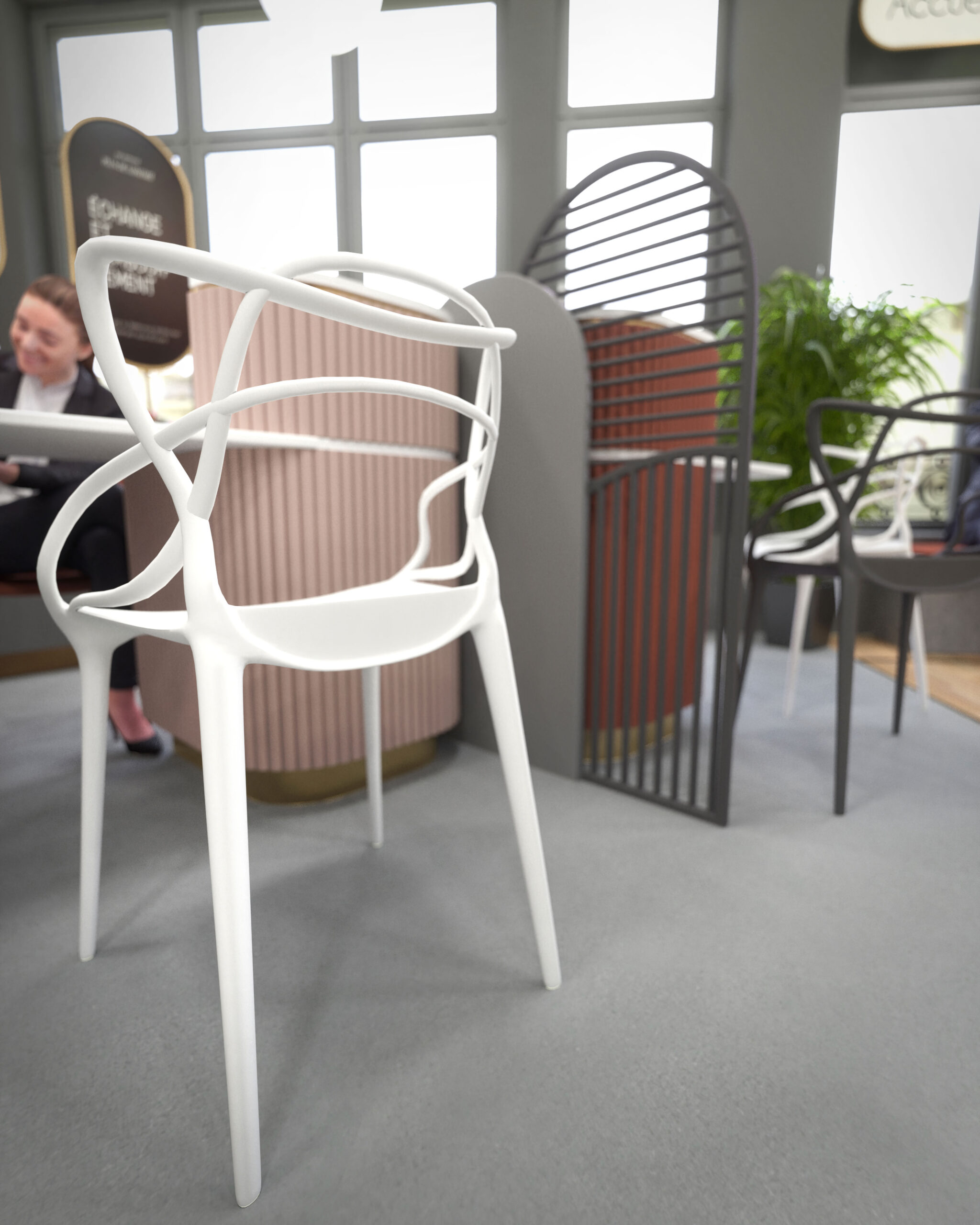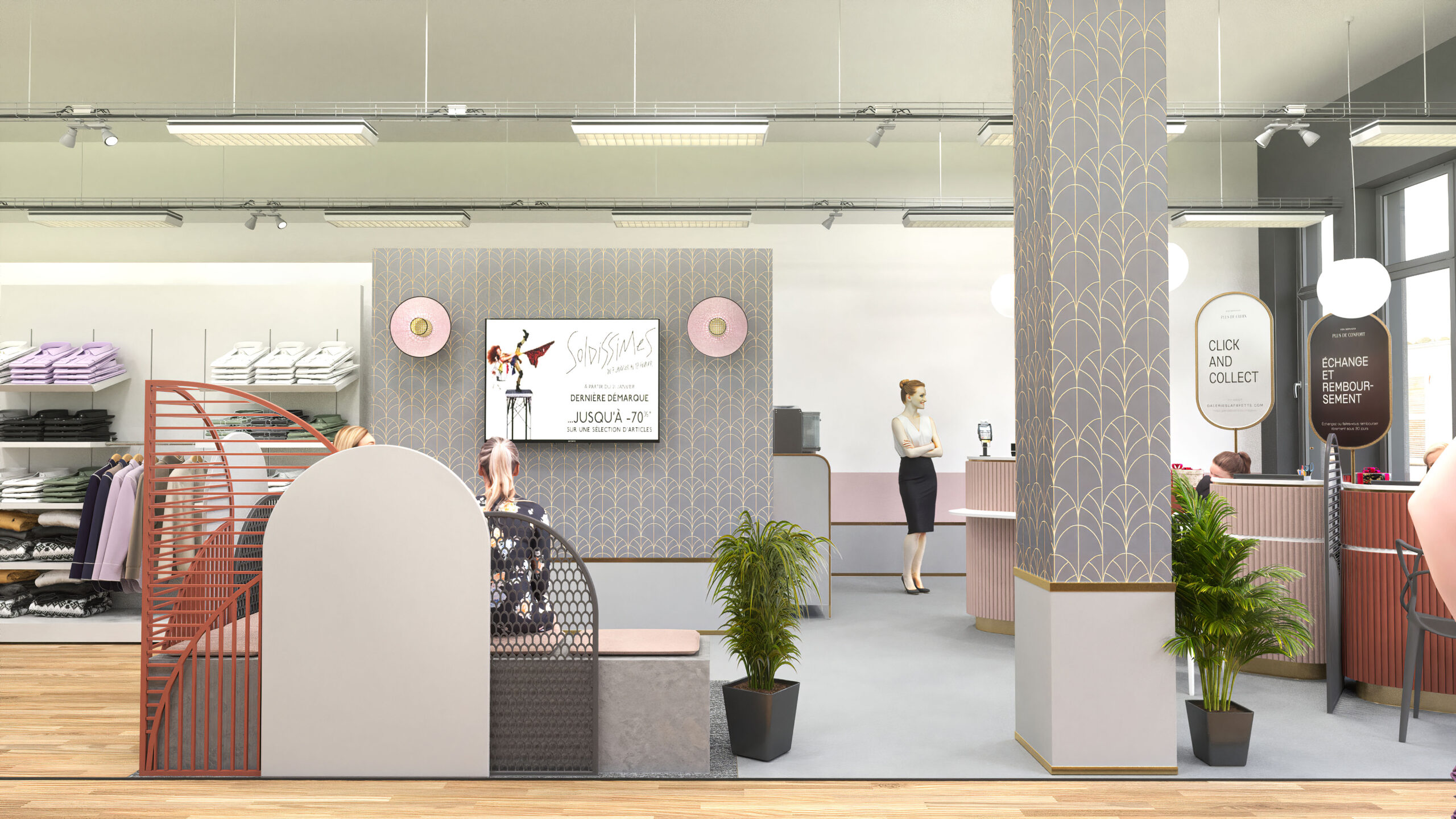 Pour ce projet, le concept « Art déco » a été choisi afin de renforcer le lien visuel avec l’identité prestigieuse des autres magasins Galeries Lafayette. Ce choix s’exprime à travers les motifs graphiques sur les colonnes, les éléments dorés et les formes géométriques du mobilier et des cloisons, qui évoquent l’élégance des années folles.