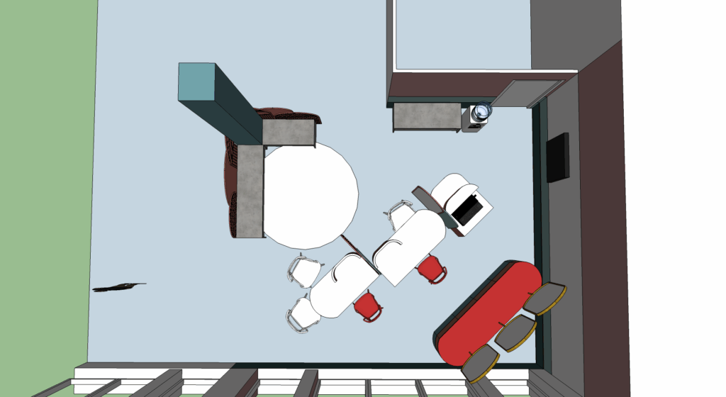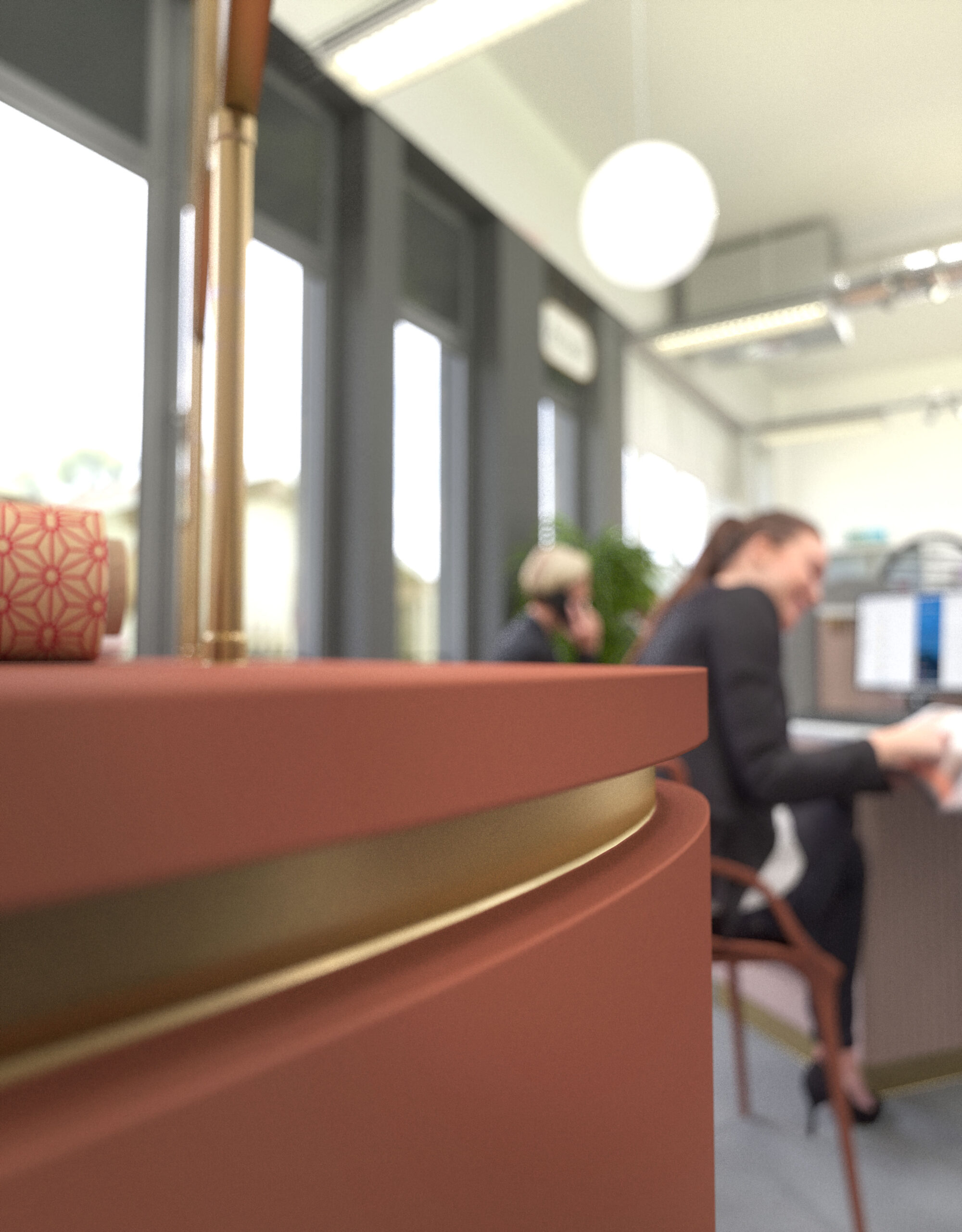 L’espace accueille les visiteurs dans une ambiance lumineuse, grâce à l’utilisation principale de murs blancs et de grandes baies vitrées. Les touches de rouge sur le mobilier rythment l’agencement et attirent le regard, tout en favorisant une circulation intuitive. Le doré, utilisé en finition et en détail sur les meubles, rappelle les codes du luxe et apporte une sophistication discrète à l’ensemble.
