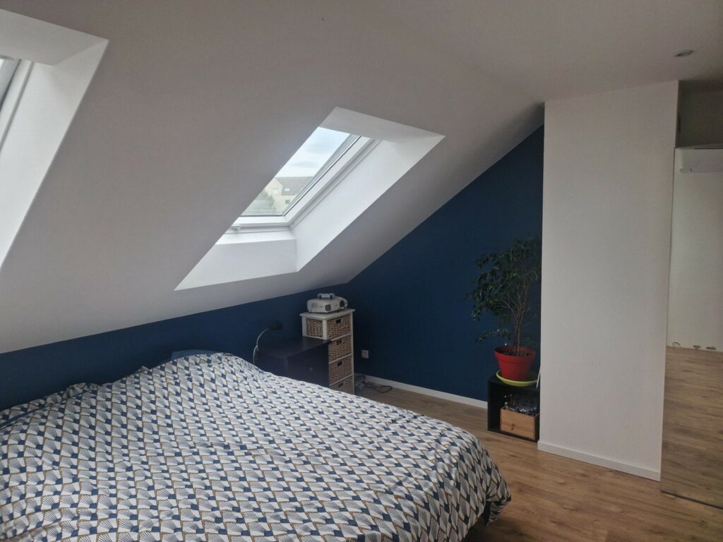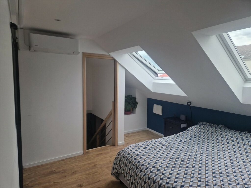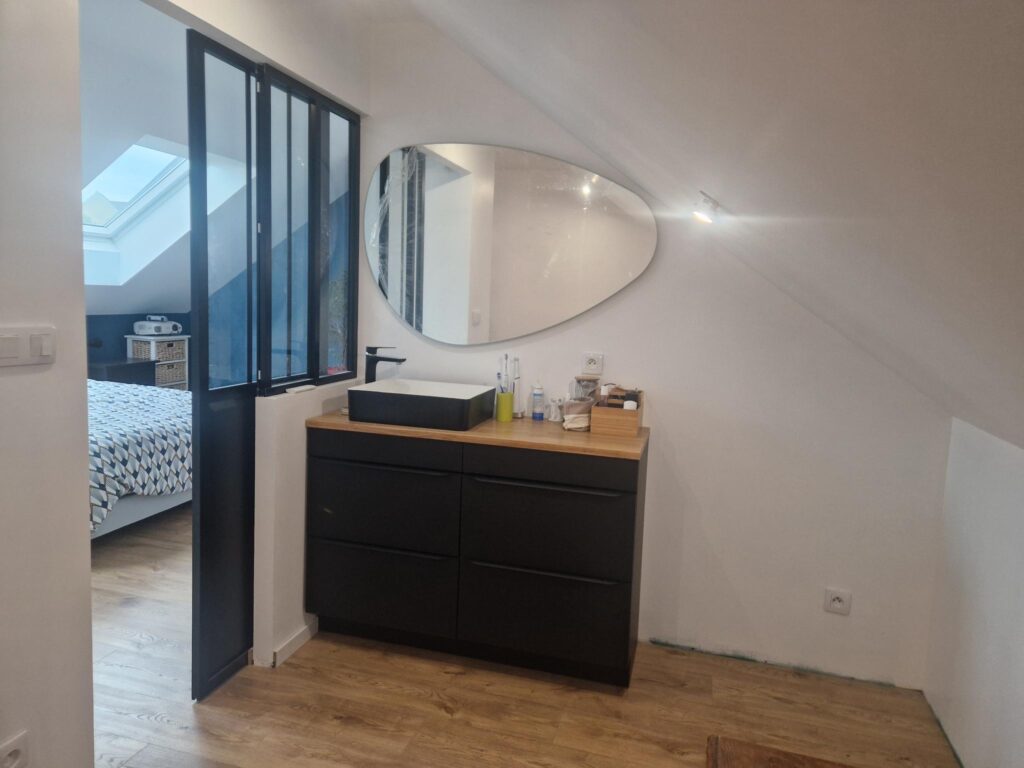 Les combles entièrement réaménagés accueillent une suite parentale composée d’une chambre, d’un dressing et d’une salle de bain privative : un véritable cocon dédié à l’autonomie et au bien-être des parents. La cohérence visuelle de la maison se retrouve dans les teintes murales harmonisées entre la cuisine, l’entrée et la chambre parentale, créant ainsi une unité chaleureuse.